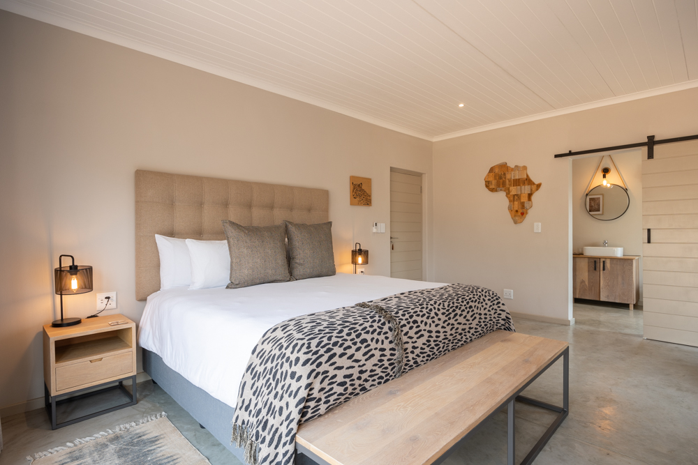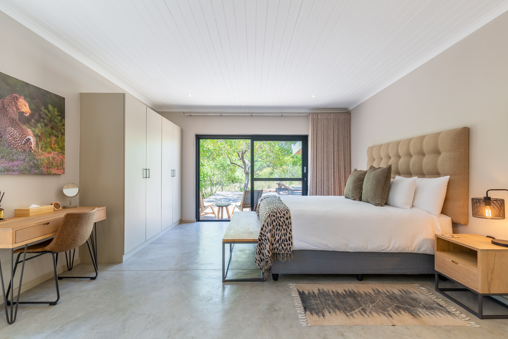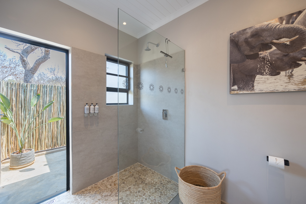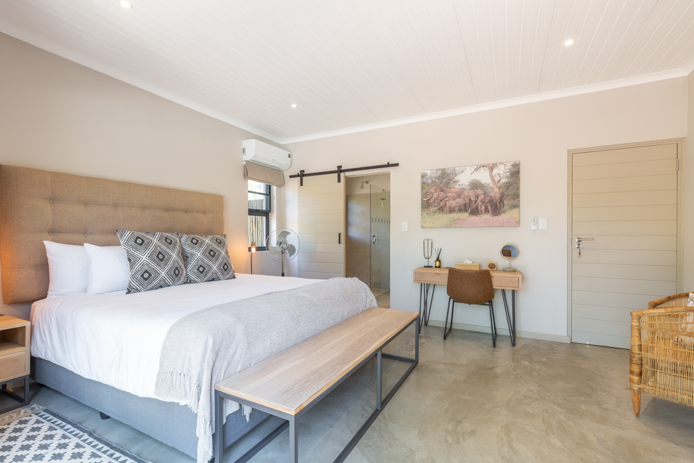 Villa Hoedspruit has three bedrooms with en-suite bathrooms, two of which have outdoor showers. The rooms are oriented around a central, open living and dining room, with a large terrace. They each have a theme around some of our favorite animals; elephants, leopards and zebras.