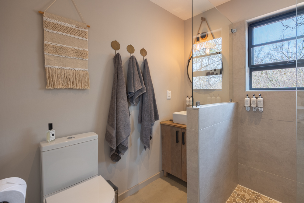 There are warm rugs and plenty of books (fiction and reference) in the living room, which also has a Samsung Smart TV and soundbar. Enjoy all the discreet, modern conveniences that luxury travelers expect; blackout curtains, fast Wi-Fi, air conditioners in the bedrooms, screened sliding doors and windows, a quiet dishwasher and washing machine, tumble dryer, filtered water, back-up power, large safes, USB plug points, fluffy towels and cotton robes, binoculars, books about birds and wildlife, and all the information you need to plan your stay. And not to forget, a nice swimming pool to cool off in during the hot summer months.
