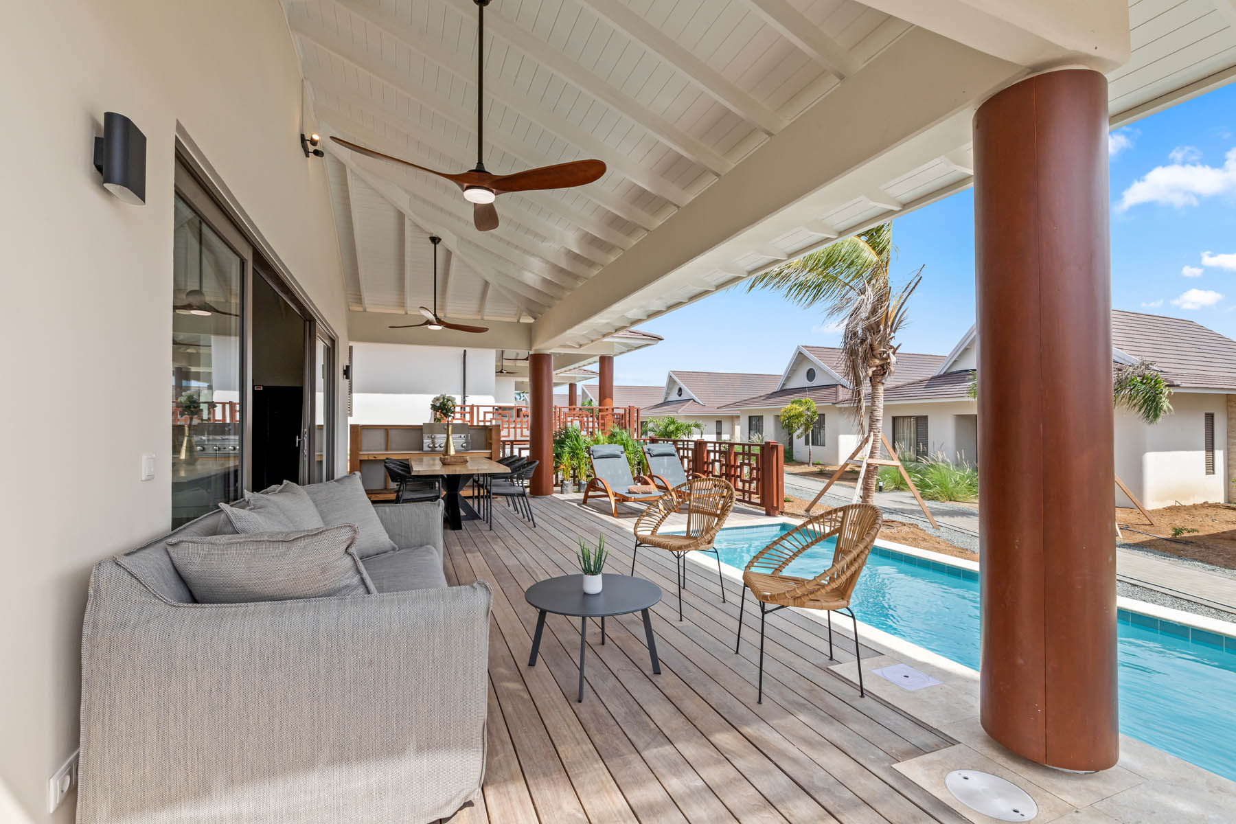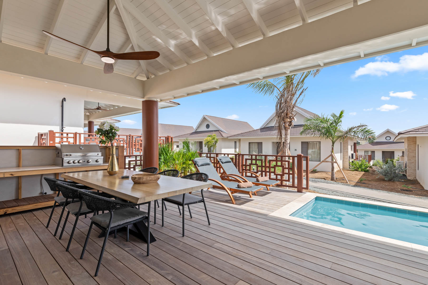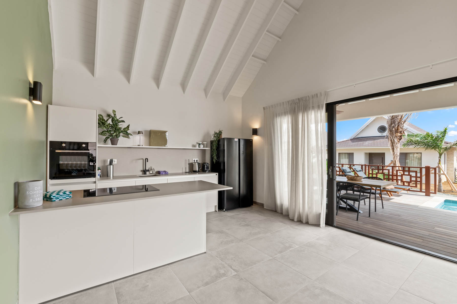 De villa met eigen zwembad biedt een unieke ervaring, gelegen aan de prachtige golfbaan van Blue Bay. De villa beschikt over drie ruime slaapkamers, elk met een eigen moderne badkamer, ingericht met hoogwaardige materialen en luxe voorzieningen voor optimaal comfort. De open leefruimte met grote schuifdeuren zorgt voor een naadloze overgang tussen binnen en buiten, zodat je volop van het buitenleven kunt genieten.