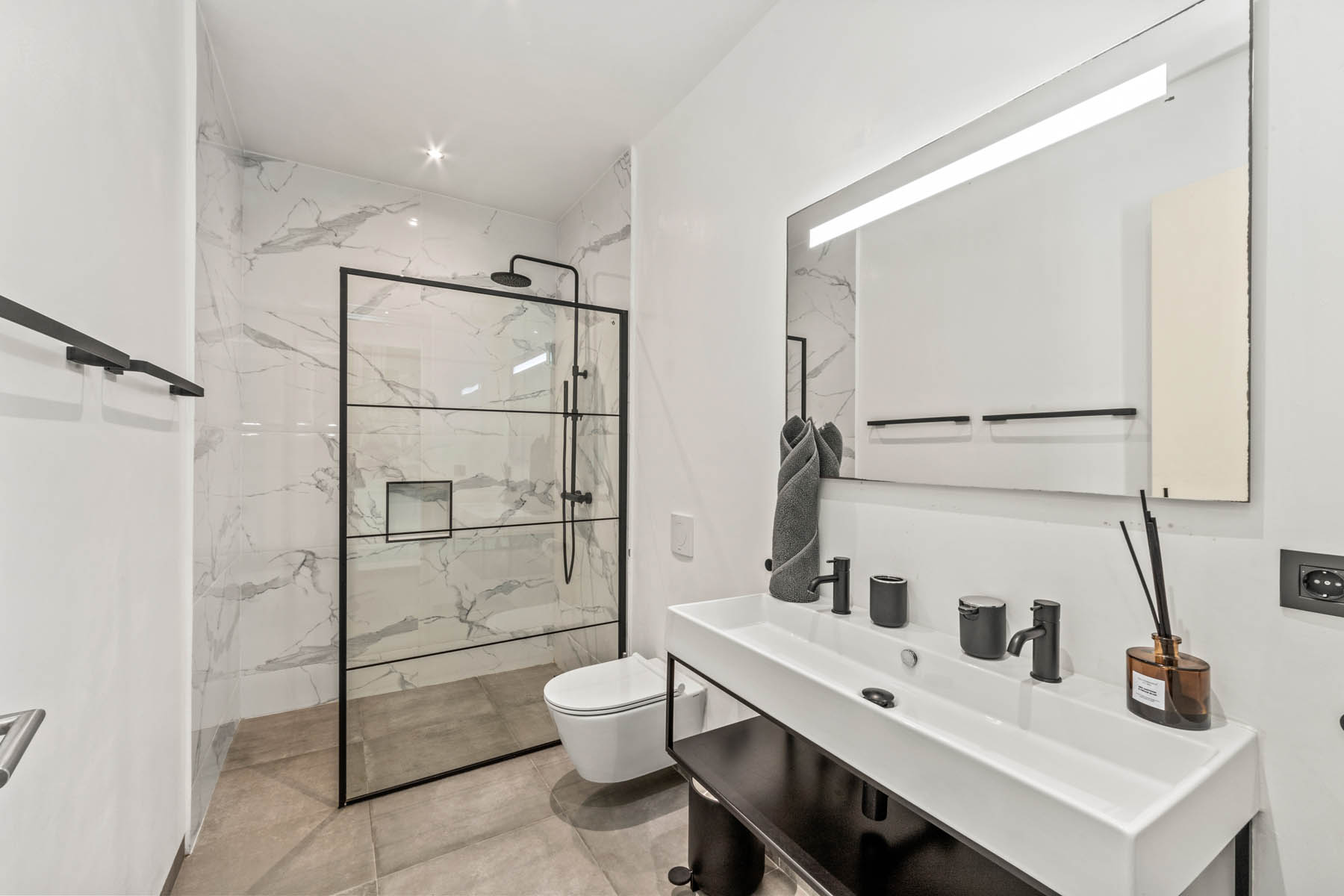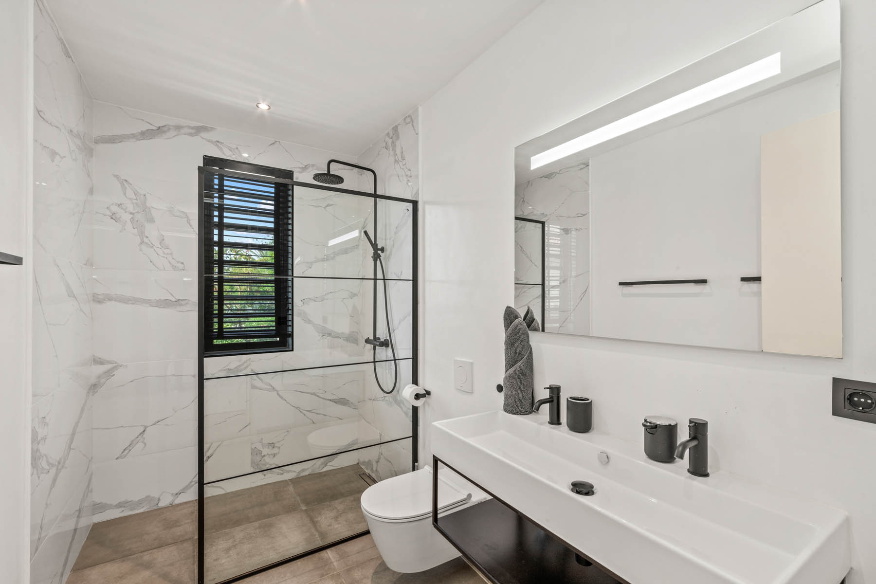 Vier badkamers en twee gastentafels uitgerust met schone handdoeken en essentiële toiletartikelen. Met inloopdouche kaptafel, spiegel, toilet, handdoeken, föhn en essentiële toiletartikelen