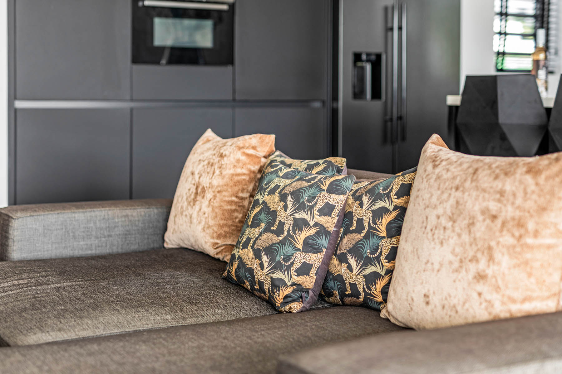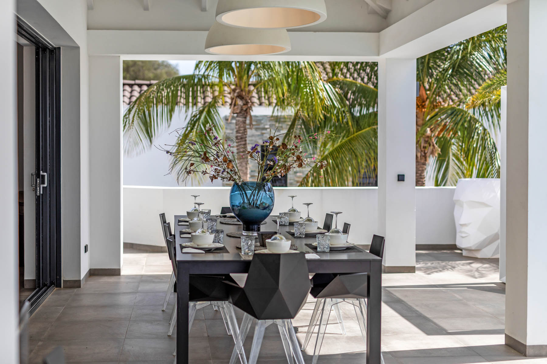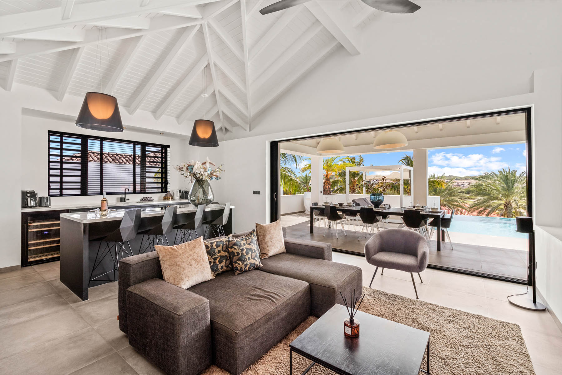 Zodra je een voet in deze luxe villa zet, word je verwelkomd door een super stijlvolle maar zeer comfortabele grote open woonkamer met een fantastisch modern interieur en ontwerp met gigantische opvouwbare schuifdeuren om de buitenkant naar binnen te brengen. Je voelt je meteen thuis! Vind je plekje op de comfortabele bank, haal je favoriete drankjes en snacks en geniet van een leuke filmavond in deze luxe omgeving.